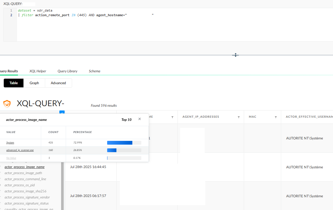 dataset = xdr_data | filter action_remote_port in (445) AND agent_hostname="xxx" - Click on âactor_process_image_nameâ after executing the search.